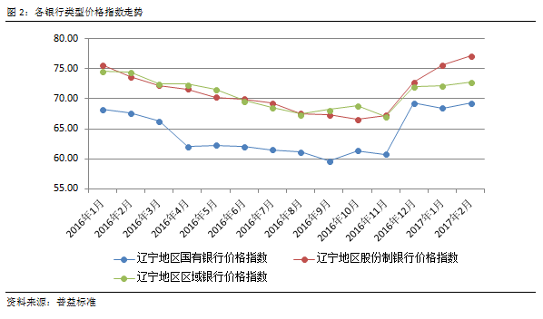 由于产品收益维持在较低水平,国有银行在12月受到资金荒的刺激也更为明显,其价格指数出现了大幅攀升,接近股份制银行及区域性银行水平。2017年2月,股份制银行价格指数节节攀升,已达77.09点,超过2016年1月水平,整体收益对投资者有较大吸引力;区域性银行2月的涨幅相对较为平稳,仅环比上涨0.62点,与股份制银行收益差距呈现放大趋势;而国有银行在1月收益小幅回落后,2月收益重新回到16年12月水平,为69.24点。受流动性压力影响,预计3月中,辽宁地区国有银行价格指数仍有上升空间。
