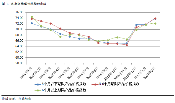 在2016年12月资金荒来临后,3种期限类型的理财产品的价格指数均反弹至70点以上,且进入2017年后,走势仍保持高度相仿。
