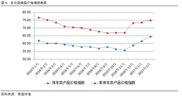 截止到2017年2月,保本类产品上涨幅度稳定,缓步攀升至64.58点,大幅超越2016年1月的61.98点;非保本类产品在16年底大幅上涨9.25%后,涨幅明显放缓,其中2月价格指数上升到75.10点,明显高于保本类产品。