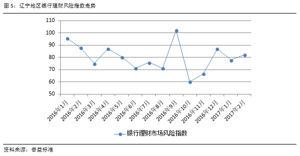 从近期的表现来看,2016年9月辽宁地区风险指数达到峰值,这主要与当月产品的违约风险较高有较大关系。2016年12月债券暴跌无疑导致市场风险明显升高,辽宁地区银行理财风险指数也遥相呼应,环比上升20.53点,达到了87.22点。