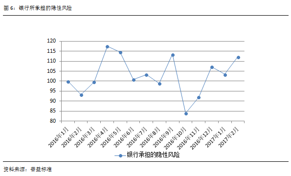 2017年初,银行迅速调整了投资方向,加重了货币市场工具和非标债权的投资比例以取代对债券市场的过分倚重,促使银行承担的隐性风险也出现下滑。进入2月份由于银行兑付压力增大,其承担的隐性风险又略有回升。