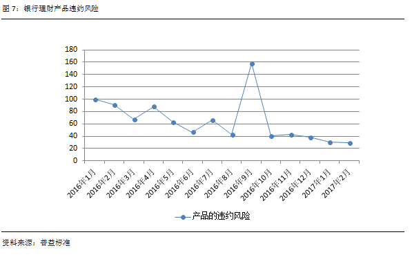 产品违约风险指的是银行理财产品到期后无法按照预期收益率兑付的风险。近期,银行理财产品的违约风险呈现缓步下滑的趋势,仅在2016年9月出现了异常波动,这与当月较多结构性产品未能兑付最高预期收益有较大关系。