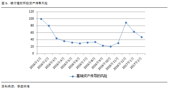 基础资产传导的风险是指由银行理财所投资的基础资产传递的风险。自2016年以来,基础资产传导风险整体呈现明显下滑趋势,但在2016年12月债券市场风险事件爆发后,此类风险迅速攀升,在12月当月上升至89.54点。虽然进入2017年以后,该风险有较大幅度下滑,于2月达到47.72点,但相较2016年中期水平而言,该风险仍然偏高。