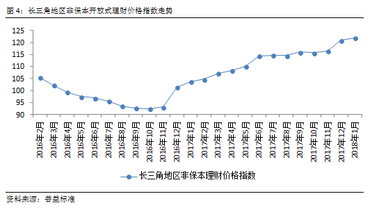 长三角地区非保本开放式理财价格指数涨幅明显收窄。正如我们上月所预期的一样,随着年末时点过去,金融机构对资金需求减弱,各类理财产品价格指数快速上涨势头将得到抑制。与开放式预期收益型产品价格指数相比,非保本开放式理财产品价格指数上涨下降幅度更为明显,说明非保本开放式理财产品受年末效应影响较大。