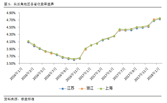 长三角各省银行理财收益增长乏力,涨势平缓。1月,长三角地区各省银行理财收益水平依旧居高不下。但受市场资金需求减弱影响,各省银行理财收益涨幅明显收窄。其中,上海银行理财收益相对较高,但与其他两省水平相差不大,反映出长三角地区各省资金需求相当。从收益走势来看,自2017年1月以来,长三角地区各省收益整体呈上升趋势,且走势趋于一致。