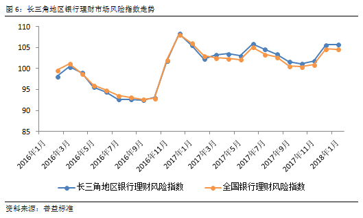 长三角地区银行理财风险维稳。1月,长三角地区银行理财风险基本维持在上月同等水平,上涨势头得到抑制。临近春节,市场投资者信心得到提振,不安定因素减弱,市场风险得到一定程度的化解。同时,新年伊始,银行业股权管理、大额风险暴露管理、委托贷款管理等监管办法接二连三出台,奠定了全年高压监管态势基调。可以预计,2018年各监管部门将加强监管协调,进一步促进金融深化改革,严控系统性金融风险。