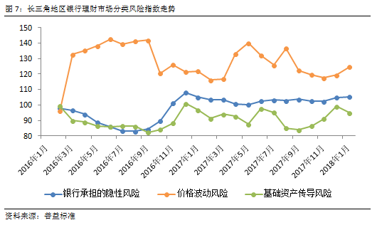 银行理财价格波动风险和基础资产传导风险走势分化,总风险得到抑制。1月长三角地区银行理财市场风险基本维持与上月同等水平,总风险指数环比上涨0.07点至105.72点,涨幅微弱。具体来看,由银行承担的隐性风险环比上涨0.51点至105.47点;价格波动风险环比上涨5.37点至124.66点;基础资产传导风险环比下降4.17点至94.98点。