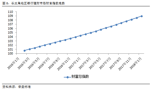 长三角地区银行理财财富加速累积。由于银行理财通常以预期收益的形式发行,因此收益与时间呈现正相关关系。由图可见,长三角地区银行理财市场财富指数随时间推移持续上行,仅有单月增幅差异的变化。2018年1月,长三角地区财富指数涨幅进一步扩大,环比上涨0.43点至108.95点,理财财富加速累积。