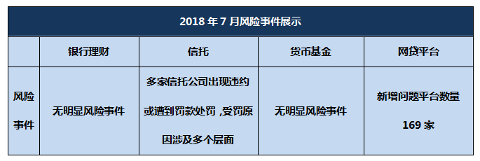 在历经一年多的理财乱象整治之后,7月银行理财无明显风险事件曝出。7月出台理财《商业银行理财业务监督管理办法(征求意见稿)》,标志着资管新规的逐步落地执行。除部分大型银行较快的推动产品净值化转型外,更多的银行将新规后第一阶段的重心放在理财业务发展方向探索上,因此业务开展相对保守,探索转型期银行相对稳健,整体风险事件爆发的可能性较小。