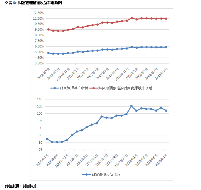 受益于降准和MLF中长期资金投放,7月银行体系流动性延续宽松态势。2018年财富管理基准收益及经风险调整后的财富管理基准收益走势相对平缓。从近期财富管理收益走势来看,7月财富管理收益指数小幅下降,但理财新规(征求意见稿)对7月收益影响尚未完全显现,多数银行处于探索观望期,产品仍然更多的受流动性变化影响。