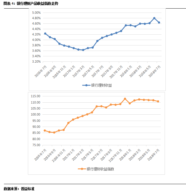流动性的相对平稳状态,促使各类理财产品整体收益呈现持续回落表现。其中银行理财产品收益保持了较为平稳的走势,环比下降4BP至4.70%;货币基金收益大幅下滑,环比下滑67BP至3.53%;信托理财产品收益7月明显回升,环比上涨42BP至8.54%;P2P产品收益环比下降8BP至9.22%。