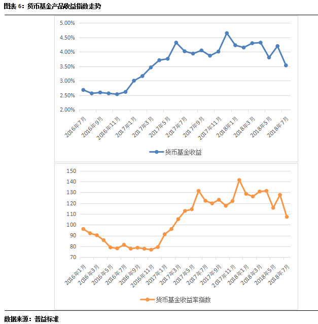 2018年7月,货币基金收益大幅下滑,环比下滑67BP至3.53%,同时,货币基金收益指数也下降20.36点至107.29点。受政策影响,货币基金收益自年初开始波动并总体呈回落趋势。进入7月后,货币基金的大幅下滑除了受流动性环境的影响外,另一可能则是在监管环境大幅收严的前提下,加之跨过半年节点流动性压力略缓,部分大型货币基金主动降低收益,压缩成本控制规模,以增强风险防控的能力。