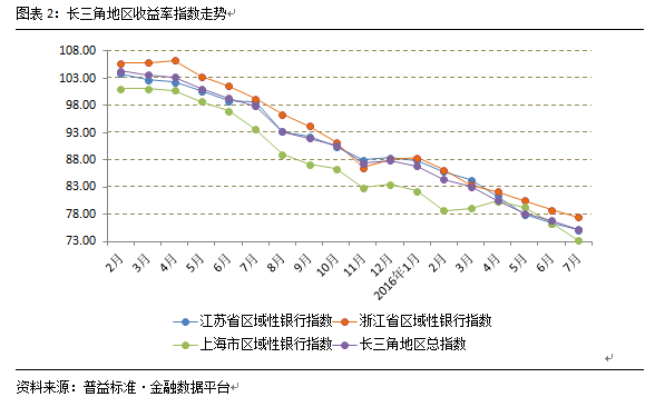 从收益率指数走势图可以看到,长三角地区本月收益率指数虽然仍呈现下滑态势,但整体下滑幅度继续呈现收窄趋势,并没有在7月出现大幅度的向下表现。江苏省区域性银行指数与浙江省区域性银行指数均表现出了下滑幅度缓步收窄的趋势,其中江苏省区域性银行指数在近两个月收窄幅度更为明显。上海市区域性银行收益率指数在4月攀升至顶点后便持续大幅下跌,截止2016年7月,上海市区域性银行收益率指数继续创出新低至73.13,下滑4.19%。
