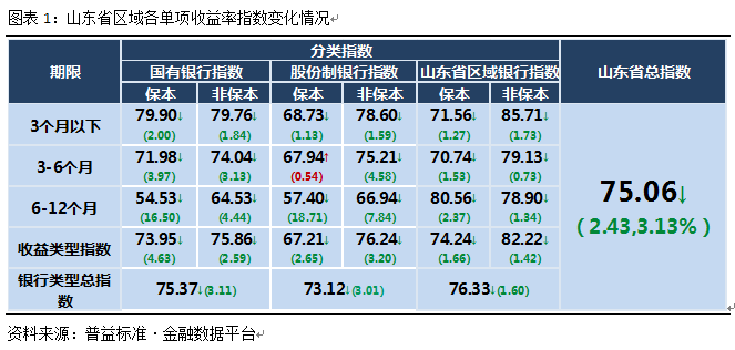 7月,山东地区银行理财指数下降2.43点至75.06点。国有行指数和股份行指数本月均出现了较大幅度的下滑,其中国有行指数下跌3.11点至75.37点,股份行指数下跌3.01点至73.12点,成为山东省银行理财收益率指数下跌的主要原因。其中,期限为6-12个月的产品成为收益率下滑的重灾区。山东省区域银行理财收益率指数下跌1.60点至76.33点,跌幅相对较小。从收益率来看,互联网宝宝类理财产品收益率在高开低走之后报收2.65%,相较上期小幅下跌0.05%;山东省区域理财收益率在经历了先涨后跌的倒V型走势后报收4.10%,在全国银行理财产品平均收益率均大幅下跌的情况下,成为难得的亮点。