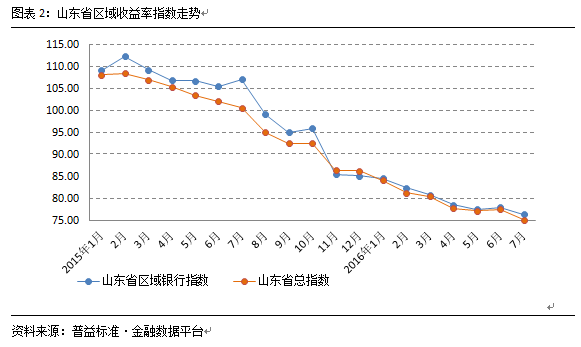 自进入2016年后,山东省区域银行指数与山东省总指数的走势保持了高度的一致性。5月收益率指数下滑的明显放缓以及6月的微幅上涨都变现较强的关联性。不过在进入7月后两者出现了一定的差异,虽然都呈现了一定的下滑趋势,但总指数的下滑幅度明显偏大,而山东省区域银行指数则维持了相对更好的稳定性。在宏观经济疲弱,监管持续收严的大背景下,下半年山东区域银行收益率指数仍有较大可能维持微幅向下的趋势。