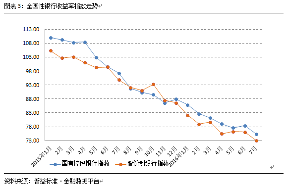 在2016年2季度中,股份制银行收益率指数整体呈现了微幅向上的趋势。股份制银行收益率指数在2季度的上升与3月末和4月初的大幅下跌有一定的关系,同时也与年中时点有一定的关系。进入7月后,股份制银行指数则出现了明显的下滑表现,跌破4月最低点至73.12。国有银行在7月前收益率指数呈现了下滑幅度逐步收窄的趋势,且在6月其指数表现出明显的向上趋势。在7月中,国有银行收益率指数在年中节点过后也出现了极为明显的下跌表现,下滑幅度达3.97%。