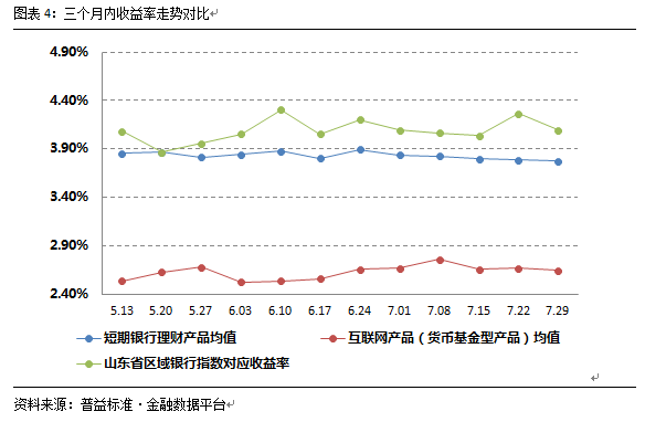自2016年5月底开始,山东省区域银行指数对应收益率就有明显走高的表现。在7月上旬,山东省区域银行收益率表现为缓步向下,下滑幅度偏小,而进入7月下旬后整个收益率则出现了明显的波动,但收益率并没有出现极为明显的向下表现。不过从7月最后周收益率重新回落的表现来看,在8月中收益率走势可能会重新回到如7月上旬般的微幅下滑状态。整体短期银行理财产品的平均水平在7月表现的较为稳定,仅从3.84%下滑至3.78%,继续维持了对互联网产品的明显优势。7月中互联网产品的收益率均值延续了6月的良好势头,继续呈现微幅上涨的趋势,平均收益率为2.69%,环比上升了16个BP。虽然互联网产品收益率出现了明显的回暖迹象,但其收益率水平仍然处于相对较低的位置,与短期银行理财产品收益率有较大差距。从7月的表现来看,短期银行理财产品保持了较为稳定的收益水平,更加确立对于互联网产品的收益率优势。从财富管理的角度来看,投资者选择同样具有高流动性的银行理财产品较非银行系互联网产品(货币基金型)更有优势。