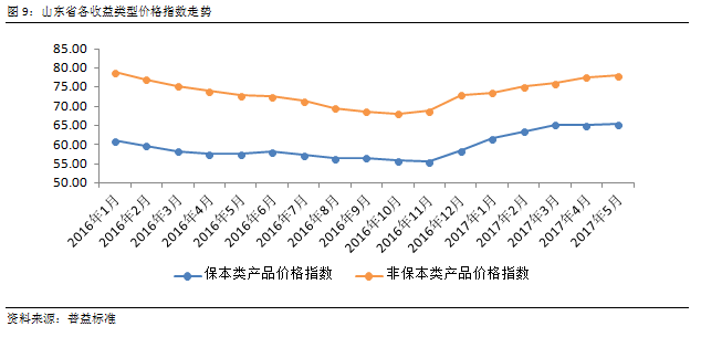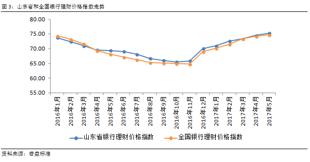 将山东省银行理财价格指数与全国银行理财价格指数对比可以发现,山东省银行理财价格指数与全国平均水平保持了较高的一致性。在2017年5月,山东省银行理财价格指数与全国银行理财价格指数出现了一定的分化,表现山东省银行理财竞争更为激烈,整体收益更有吸引力。