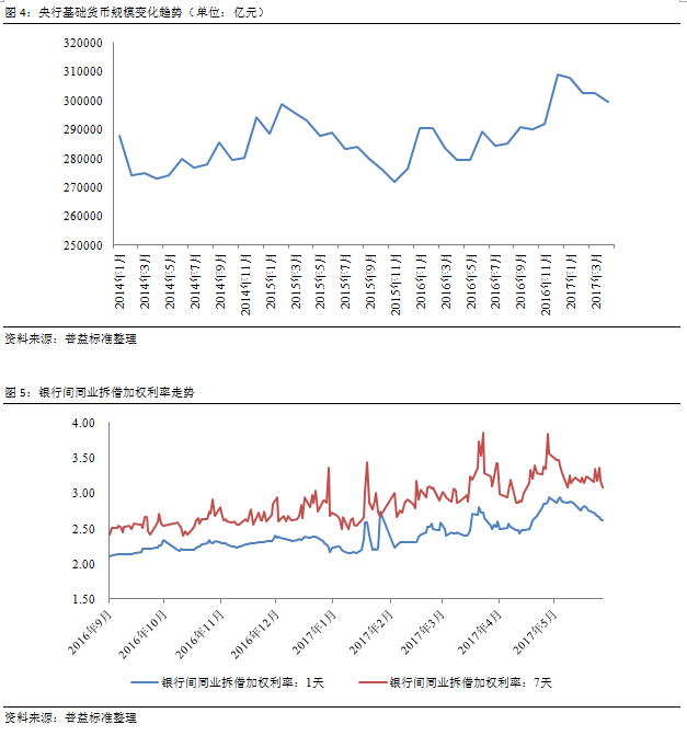 银行理财市场价格指数走势变化一方面受资金供求关系影响,另一方面还受基础资产收益表现影响。从资金供求关系看,图4直接反映了基础货币市场过去一段时间资金规模走势,可发现自2017年初以来,央行基础货币投放趋于下降,这一变化是央行执行稳健中性货币政策的直接体现。基础货币投放量的降低直接影响资金供给,这是导致近一段时间资金市场和债券市场紧张的根源,进而诱发银行理财市场价格指数自年初以来持续走高。