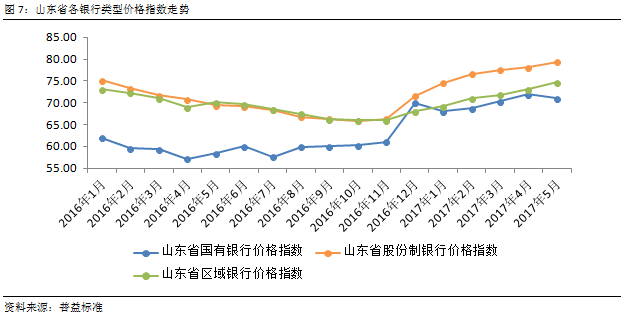 此外为应对季节性流动性需求并稳定市场预期,自5月下旬以来央行加大市场资金投放力度,直接导致近期资金市场价格下降,而山东省银行理财市场价格指数因此放缓了上行步伐。另外大型金融机构往往直接从央行处获取资金,是资金市场资金提供方,随着资金量趋于充裕,大型银行有动力降低理财产品成本。就山东省而言,银行理财市场价格指数增幅放缓,更多源于国有银行理财产品价格走低,直接体现了上述资金成本传导机制。