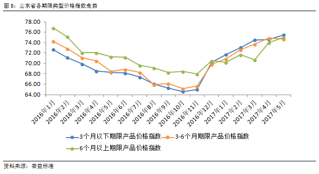 2017年5月,山东省银行理财市场价格指数延续了上涨表现,但涨幅有所收敛,环比上涨0.76点至75.36点。从银行类型看,山东省股份制银行和区域银行理财市场价格指数环比都有所上升,且涨幅相对较强,其中股份制银行环比上行1.32点至79.43点,而区域银行价格指数环比上涨1.52点至74.73点。与山东省股份制银行及区域银行较强的上涨趋势不同的是,国有银行指数出现了一定幅度的下滑,环比下滑0.87点至71.07点。从期限类型看,短期限指数及长期限指数均呈现上涨表现。显示出山东省银行理财对短期限及长期限资金需求强烈。