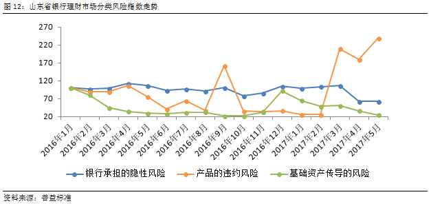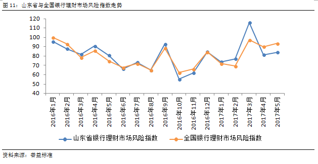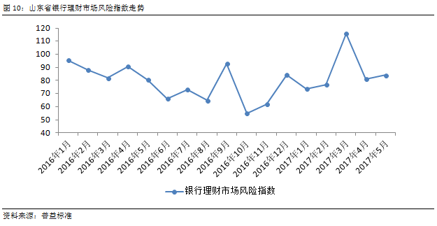 经比较可以发现,在2016年,山东省银行理财市场风险指数走势与全国指数走势相符,但进入2017年后,山东地区银行理财市场风险指数走势与全国平均水平呈现了较大的差异。在同年3月市场整体风险冲高后,山东省风险指数迅速回落,于4月、5月明显低于全国水平,显示出山东省银行理财稳定性更强。