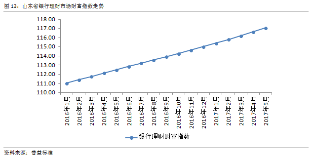 由于银行理财通常以预期收益的形式发行,因此收益与时间呈现正相关关系。由图可见,山东省银行理财市场财富指数随时间推移持续上行,仅有单月增幅差异的变化。2017年5月,山东省财富指数达117.07点,较4月增长0.42点,环比上涨幅度为0.36%,增幅与上月持平。
