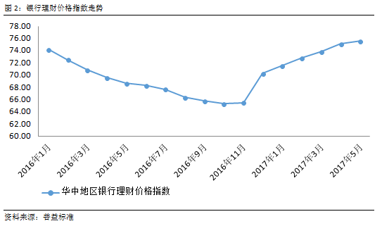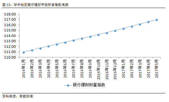 由于银行理财通常以预期收益的形式发行,因此收益与时间呈现正相关关系。由图可见,华中地区银行理财市场财富指数随时间推移持续上行,仅有单月增幅差异的变化。2017年5月,华中地区财富指数达117.03点,较4月增长0.43点,环比上涨幅度为0.36%,与上月持平。