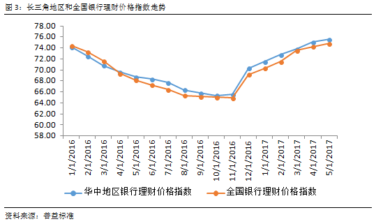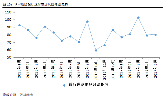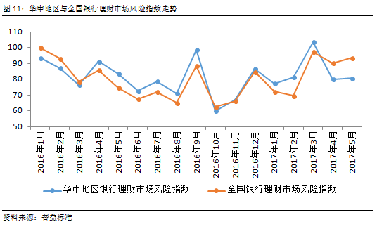 经比较可以发现,在2017年3月之前,华中地区银行理财市场风险指数相对全国银行理财市场风险指数偏高,但在3月市场整体风险冲高后,华中地区风险迅速回落,于4月、5月明显低于全国水平,显示出华中地区银行理财稳定性更强。