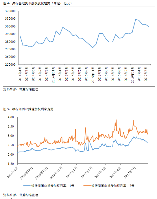 银行理财市场价格指数走势变化一方面受资金供求关系影响,另一方面还受基础资产收益表现影响。从资金供求关系看,图4直接反映了基础货币市场过去一段时间资金规模走势,可发现自2017年初以来,央行基础货币投放趋于下降,这一变化是央行执行稳健中性货币政策的直接体现。基础货币投放量的降低直接影响资金供给,这是导致近一段时间资金市场和债券市场紧张的根源,进而诱发银行理财市场价格指数自年初以来持续走高。