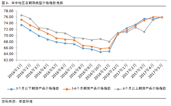 5月,华中地区各类型银行理财市场价格指数走势展现了一定的差异。其中,股份制银行理财市场价格指数仍然维持高速上涨表现,环比上涨1.29点至79.49点,上升幅度为1.65%,较4月涨势有微幅放大趋势,预计6月该趋势仍将延续。区域银行理财市场价格指数与股份制银行走势相仿,环比上涨1.21点至75.15点,延续了上月较强的涨幅。而与股份制银行和区域银行不同的是,国有银行理财市场价格指数出现了下跌,环比下跌0.73点至71.26点,下降幅度为1.01%,改变了自2017年初以来的上涨势头,也促使华中地区价格指数增速明显放缓。而这背后的原因在于自5月下旬以来央行加大市场资金投放力度,导致近期资金市场价格回落,而大型金融机构往往直接从央行处获取资金,是资金市场资金提供方,随着资金量趋于充裕,大型银行有动力降低理财产品成本。