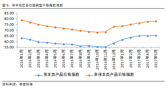 从产品收益类型看,2017年5月华中地区理财产品各收益类型财富指数继续增长,其中非保本类产品涨幅高于保本类产品。具体来看,非保本类产品财富指数上涨0.44点至117.81点,保本类产品财富指数上涨0.36点至115.05点,相比而言,非保本类产品在收益上更具优势。长期而言,由于监管政策要求,未来银行资源将逐步偏向非保本类产品,该类产品对于投资者财富积累的价值更趋凸显。
