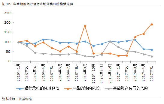 5月,华中地区由银行承担的隐性风险以及基础资产传导的风险继续下滑,相比4月环比下跌幅度为-4.57%和-28.32%,分别降至61.55点和27.05点,这显示出基础资产收益波动和银行隐性风险波动均有所下降。当前,在监管政策收紧背景下,保持资本市场稳定,实现银行理财产品合规经营将成为今后发展主基调,可以预计华中地区由银行承担的隐性风险和基础资产传递风险将进一步趋缓。
