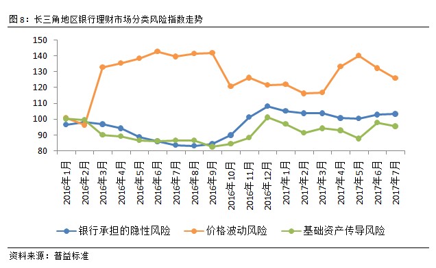 长三角地区银行理财风险指数明显下滑。7月,长三角地区银行理财市场风险指数开始下滑,环比下滑1.23点至104.62点,下滑幅度为1.16%。其中,价格波动风险指数在上月明显下滑后,本月继续回落,环比下滑6.22点至125.82点;银行承担的隐性风险相比上月有小幅上行,但整体上涨幅度较小,仍然处于低位,对银行理财整体风险影响不大;基础资产传导风险继续表现出低位震荡的局面。从7月风险指数表现来看,央行维持流动性较为宽松的局面及年中考核结束均有利于银行理财风险的缓释。