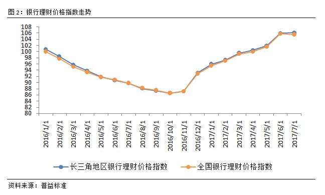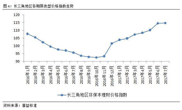 将长三角地区银行理财市场价格指数与全国银行理财市场价格指数对比可以发现,2017年7月,两类指数出现了一定的差异。虽然两类指数在6月都明显上涨,但7月中,长三角地区价格指数仍然维持了微弱的向上趋势,而全国价格指数则明显下滑。就6月长三角地区价格指数的变化而言,较高的价格指数凸显了该地区的资金需求更为强烈。