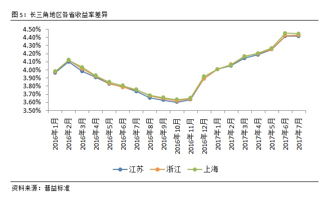 长三角各省银行理财平均收益与6月持平。7月长三角地区各省收益上涨幅度均大幅放缓,整体收益基本维持在了与6月相当的水平。对比各省理财产品的收益表现来看,上海地区理财产品收益表现较为突出,7月该地区理财产品收益达4.44%,环比下滑1个BP;浙江省理财产品收益则环比上涨1个BP至4.43%;江苏地区理财产品收益维持4.42%不变。长三角各省市收益的接近,凸显长三角各省市投资者财富管理需求具有内在一致性。