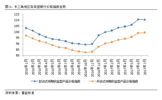长三角地区银行理财指数涨幅明显放缓。2017年7月,长三角地区银行理财市场价格指数在经历了6月的一波冲高后,上涨幅度迅速放缓,环比上涨0.55点至106.04点。自6月起,央行表明要保障市场流动性后,资金面紧张的局面出现明显缓和表现。不过由于6月年中考核的影响,理财产品收益表现仍然居高不下。但进入7月后,由于年中考核结束以及资金面宽松局面的持续,银行理财收益上涨幅度出现了较大程度的放缓,较多银行收益显露出了向下趋势。具体来看,封闭式预期收益型产品价格指数为110.40点,环比下滑0.16点;开放式预期收益型产品价格指数为99.04点,环比上行0.48点。从封闭式及开放式的收益表现来看,封闭式预期收益型产品价格指数已在7月小幅回落,而开放式理财产品由于上涨趋势相对平缓,因此仍然维持了微弱的上涨表现,但涨幅也大幅收敛。虽然7月整体收益有回落倾向,但由于流动性中性偏紧的基调未发生实质改变,因此银行理财价格指数不太可能在短期出现大幅下行的表现。