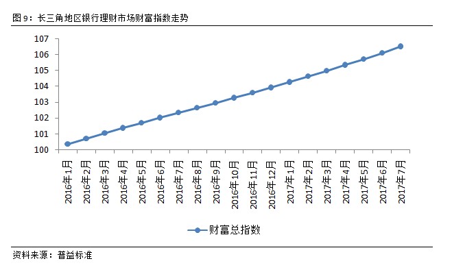 长三角地区银行理财产品赋予投资者稳定的投资回报。由于银行理财通常以预期收益的形式发行,因此收益与时间呈现正相关关系。由图可见,长三角地区银行理财市场财富指数随时间推移持续上行,仅有单月增幅差异的变化。2017年7月,长三角地区财富指数达106.50点,较6月增长0.39点,环比上涨幅度为0.37%,与6月涨幅持平。大多数投资者均对固定收益型产品有一定的需求,而长三角地区银行理财财富指数稳定的增长曲线有利于投资者对自身资产进行保值及增值,符合投资者的利益需求。