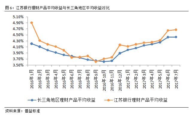 江苏银行理财收益明显高于长三角地区平均水平。虽然地区平均收益水平具有趋同性,但不同的银行之间仍然有明显的差异。就长三角地区来看,江苏银行理财产品平均收益在近期明显优于长三角地区平均水平,截至2017年7月,该行理财产品平均收益为4.67%,领先长三角地区平均收益24个BP,较6月领先幅度继续放大。从投资者收益角度考虑,江苏银行理财产品于长三角地区拥有较强的投资价值,投资者可以持续关注。