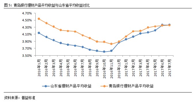 青岛银行理财符合山东省银行理财平均水平。从整体走势来看,2017年上半年山东省银行理财产品平均收益持续走高,尤其在6月向上态势较为明显,但7月收敛幅度也较大,整体变化不太平滑。从具体银行来看,青岛银行理财产品整体定价更为合理,受短期因素影响较小。该行理财产品自2017年3月起就呈现了收敛的上涨表现,且在7月并未因6月的年中考核完结而出现收益上涨幅度收窄的表现,凸显了该行在产品管理及定价策略上的优势,保证银行自身利益的同时,切实的维护客户对于低风险投资品的需求。预计8月青岛银行理财产品收益或将重新站在山东省理财收益平均水平之上。