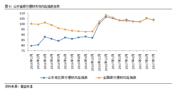 2017年7月,山东省银行理财产品风险明显下滑,环比下滑1.48点,跌幅为1.41%。随着市场流动性维持宽松表现以及银行理财负债端结构逐步转向零售端,山东省银行理财风险指数或将持续下行。另外,风险指数的变化也能在一定程度上反映地区理财发展程度的变化。从近1年般的风险指数走势来看,山东省银行理财风险指数走势与全国平均水平持续趋近,突出该地区在业务创新、业务拓展方面逐步成熟。
