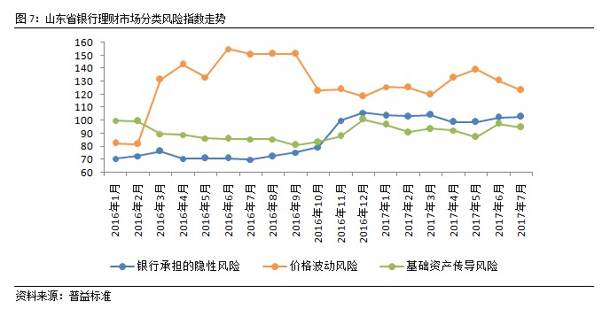 基础资产传导风险上涨明显,价格波动风险有所下滑。7月,山东省银行各类理财风险表现出稳中有降的态势。其中价格波动风险下滑明显,是推动整体风险指数下滑的主要动力,环比下滑7.53点至123.22。连续两月的明显下滑与央行调节市场流动性有较大关系,不过由于整体货币政策仍然保持中性偏紧趋势,预计该风险的下滑幅度将逐步收窄。在价格波动风险下滑的同时,基础资产传导风险也表现出了微幅下行走势,相比6月环比下滑2.53点,至94.70点。基础资产的下行与债市的回暖有密切关系。债市在经历了上个季度的调整后逐步企稳,整体发展前景向好,利好较为依托债市的银行理财市场。虽然银行承担的隐性风险有微幅回升,但相对平稳的变化,不会影响山东省银行理财风险指数的下行趋势。