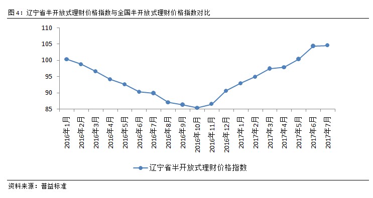 辽宁省半开放式理财价格指数与全国平均水平持平。7月辽宁省半开放式理财产品价格指数微幅上涨。从前期表现来看,2017年4月至6月该指数受资金面趋紧、年中考核等短期因素的影响,呈现大幅上涨表现。但至7月,随着央行调控流动性及年中考核完结,辽宁省半开放式理财价格指数表现趋于平缓。从近期监管的态度来看,过高的理财产品收益加大了银行的负担,部分银行理财产品出现产品端与资产端收益倒挂的情况,因此随着监管的关注以及年中时点的过去,各类理财产品价格指数将逐步回落。
