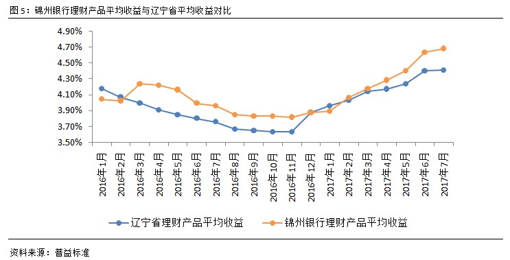 锦州银行理财产品平均收益稳定上行,凸显地区竞争力。2017年上半年,锦州银行理财产品收益表现出了较为稳定的上行变化,自3月起与辽宁省平均收益的差距便持续放大,利于投资者进行资产的保值与升值。在7月,当辽宁省理财产品收益上涨幅度明显收窄之际,锦州银行理财产品平均收益继续上行,环比上扬5个BP至4.68%。从收益走势来看,6月为应对年中考核部分银行提升收益率吸引资金的做法促使其收益在7月大幅回落。而锦州银行更为稳健且持续性更强的收益表现更具市场竞争力,辽宁省的投资者可以更多地关注相应产品以达成在低风险环境下的收益最大化。