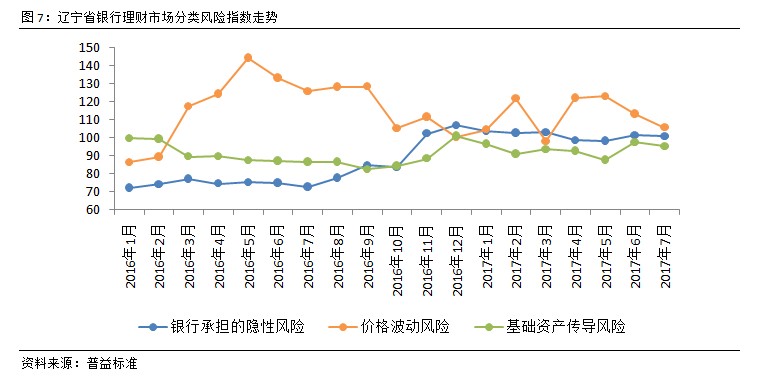 价格波动风险持续大幅下行态势。7月,辽宁省银行承担的隐性风险以及基础资产传导风险冲高回落,分别环比下滑0.61点和2.13点,至100.70点和95.23点。近期,债市经历了三个季度调整后逐步企稳,促使基础资产传导风险缓步下滑,预计该类风险将呈现平稳的下行表现。推动辽宁省银行理财风险大幅下行的是价格风险的持续回落。自6月资金面紧张局面有所缓和后,银行理财资金成本有所回落,理财产品定价空间相对更大,产品端与资产端收益倒挂的压力降低,价格波动风险也随之回落,环比下滑7.75点,至105.43点。随着监管边界的明晰,以及功能性监管的普及,过去的灰色地带将逐步减少,行业透明度的增强有利于各类风险的持续下行。