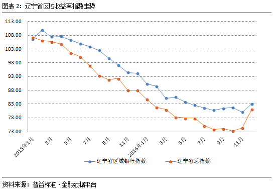 从收益率指数走势图可以看到,虽然经过前几个月的下调,但是随着年底将近,出现了一波探底反弹情形。辽宁省总指数继11月小幅上调后,在本月表现出了大幅上升趋势,环比上调9.15%,几乎回到2016年2月份的水平。辽宁省总指数涨幅的变化受全国性银行影响更大,因此不排除下个月区域银行指数与继续走高的可能。从全年角度看,1至8月收益率指数不断下滑,但8月份之后出现底部窄幅调整,11月、12月收益率连续上调,接近二季度水平;从局部看,自8月份以来收益率指数变动趋于平缓后,年底行情推动指数持续反弹,未来短时间内或可保持,而长期来看,资产不足的大背景如果没有改善,未来收益率仍有较大可能回归底部窄幅震荡。