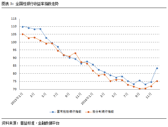 本月,国有银行指数与股份制银行指数均大幅上调。其中,国有银行指数继11月微幅回调后,12月出现了很大幅度的增长,环比上升8.94点,一举超过2016年2月份的指数水平。这一现象的主要原因是建行产品收益变化过大(建行由于产品存量较多,对国有银行的权重影响较大),其保本类和非保本类产品平均收益率涨幅均在17%左右。另一方面股份制银行12月收益率指数上扬,环比上调了3.35点,虽然没有国有银行上调幅度大,但基本维持了11月的上扬趋势。