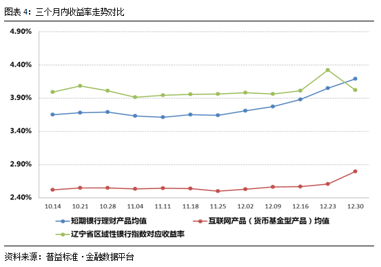 自10月中旬至12月中旬辽宁省区域银行指数对应收益率基本保持一个稳中有升的趋势,12月底辽宁省区域银行指数对应收益率有一个较大的波动,但最终回到之前的收益率水平。其中当月最高收益率为4.32%,最低收益率为4.01%,差值达到为31个BP。从三个月情况来看,收益率基本维持在4%左右。而与之相对比,短期银行理财产品的收益率平均水平在经历了前两月的稳中有升后,在12月出现大幅上涨,最后在月末稳定在4.19的水平上。本月互联网产品收益率持续攀升,最高至2.80%,但与辽宁省理财产品收益率仍有较大的差距。从近3个月的走势来看,互联网产品收益率整体波动不大,由于本月短期银行理财产品收益也有一定幅度提升,因此两者差距仍然较大,在对资产进行保值的选择上,短期银行理财产品的优势依然明显。