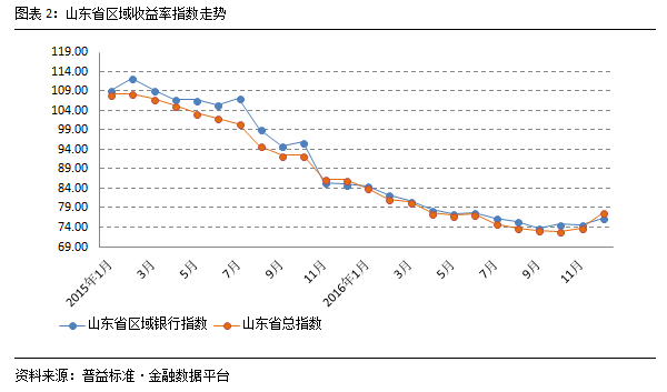 从收益率走势图可以看到,12月山东省区域银行指数出现大幅上涨的表现。以全年角度来看,除了10月份山东省区域银行指数出现微幅上涨,全年其他月份指数一路下滑,本次反弹是继10月份后出现的第二次反弹,且幅度较大,环比上涨3.38%,整体表现基本符合上月预期。10月份以来,山东省区域银行指数不断调整,触底可能性不断增大,同时受年末效应影响,全国性银行指数大幅上涨,山东省总指数连续两个月涨幅年内最大,带动山东省区域银行指数稳步上调。本次年末理财行情推动是指数上涨的主要因素,短期内或可维持相对高位,但长期来看,在无重大政策利好的前提下,上涨空间仍较为有限。