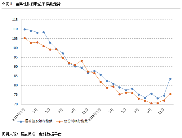 2016年12月,山东省区域银行指数对应收益率整体为调整上升态势,月初延续上月表现微幅上升,但在中旬出现短暂回调,随后月末发力,收益率回到10月初4.10%的高位。本月最高收益率为月末值4.41%,最低收益率为月初值3.91%。差值达到23个BP,平均收益率为3.99%。青岛银行收益率本月表现稳定,自上月末收益率出现大幅下滑后,后续稳步上涨,同山东省区域银行指数对应收益率之间的差距缩小。